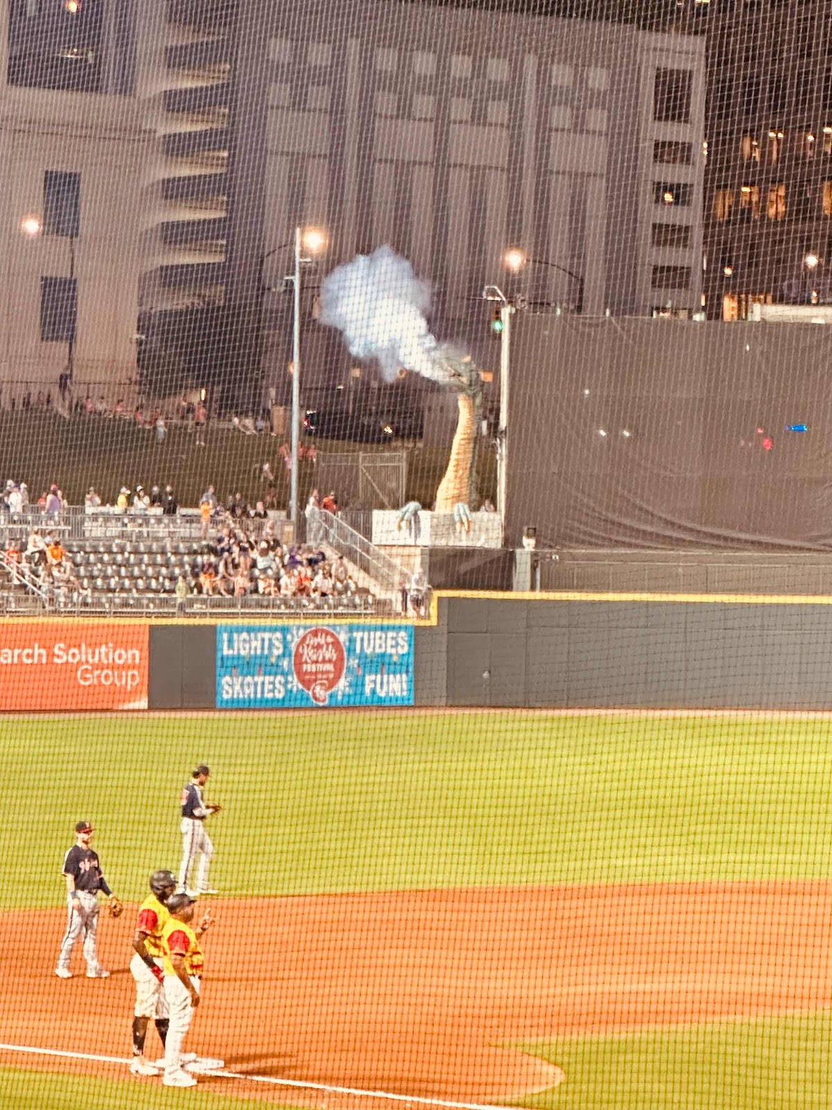 The minor league team is called The Charlotte Knights. The mascot is a dragon. There's an animatronic dragon that blows smoke if there's a home run. Angus was baffled about the mascot being a dragon. "Knights fight dragons?" we said. "Yeah, but a knight is a thing. You could have a knight mascot. It's not like the Aggies where you're like what the hell is an aggie." And that was a solid point, to which I had no rejoinder.