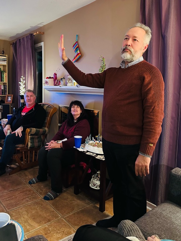 We had people over for New Year's Eve, as usual - the same people as the Christmas party, but a scaled-down version of the festivities, with music and conversation and usually a game or two. This year I had bought Canadian charades, which was very fun and amusing and would have been really difficult if we hadn't decided to forego using the timer. I enjoy observing the different processes employed by various players of charades. Some people pick a card and immediately grab their head as if the difficulty level has given them an aneurysm while others just get on with it. If the first technique doesn't get any good guesses, some people will change it up while others go with just repeating the same gesture or ceasing the motions altogether and just staring at everyone expectantly.