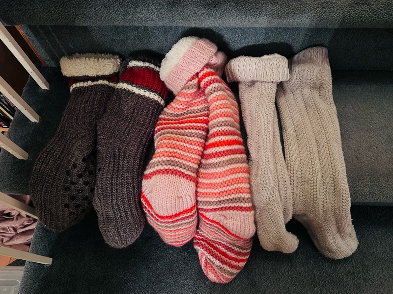 The pics are mainly to show that when people come to our house they all wear thick sweaters, while I will be sleeveless and still too hot. I also offer cardigans and fleecy reading socks.