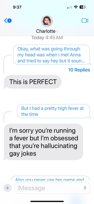 My niece is brilliant and hilarious and we have a lot of similar mental health issues, so our text chain is robust and far-ranging. One of the best episodes in our history was when I met her first girlfriend and tried to say 'hey' but choked a tiny little bit and so it sounded the slightest bit like 'gHEY', which had us all doubled over howling with laughter. Her new girlfriend is bi, so under the influence of opioid cough syrup I texted "hey, remember when I met your first gf and said gay? I was thinking what if I meet this one and it all goes great and then at the end I say 'bye' and you scream "WHAT THE HELL IS WRONG WITH YOU".