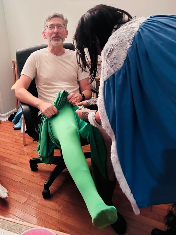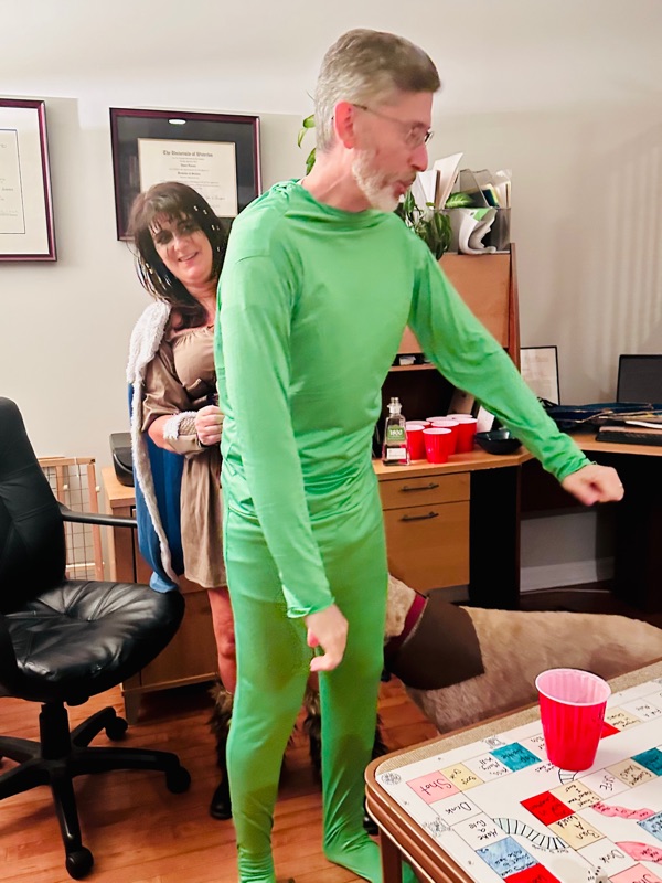 I was relying on Rachel's girlfriend Alina to help me find my playing piece and move it the appropriate number of spaces and then read whatever was on the space, not because I was too drunk to read, but because my eyes were too old and I didn't have my reading glasses. So I should not have been surprised when Collette later revealed that the younger set started conspiring to have Michael land on all the spaces with embarrassing stuff. This worked out fine because Michael is a good sport, and is probably the only one that would have been able to wear Rachel's costume easily when they had to trade.