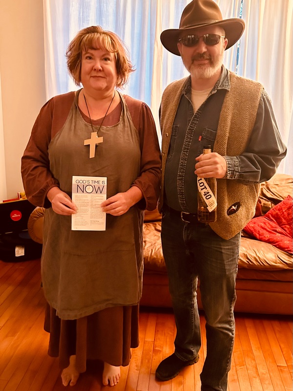 | I thought this might be the year I had to go costume-less and drink the penalty drink. Then I found this 'God's time is NOW' pamphlet in the mailbox in the morning and riffed on it. |