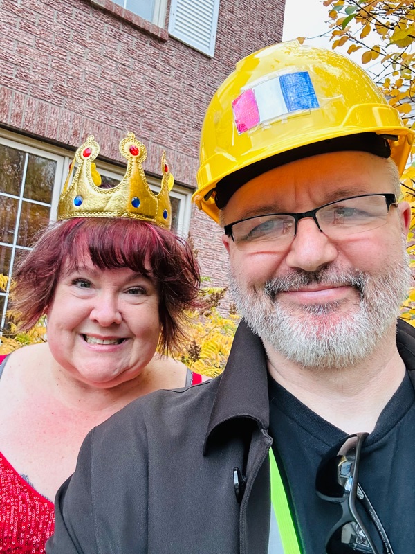 I believe I usually milk the Halloween thing for at least one or two days of NaBloPoMo, which I shall continue today. A couple of people commented on our Louvre Robbery costumes as 'timely', to which I replied "yes, almost as if we didn't have a single costume idea before that, he he *nervous chuckle*). Our friends Janet and Dave have a Halloween party on the Saturday before Halloween every single year, so I have zero excuses for being caught costume-less two days before the party, and yet I went to the craft show and for lunch with my friends Pam (HI PAM) on Thursday and confessed that I was completely costume-blocked. She blithely said "just pick something from the news. How about the Louvre Robbery?"(YOU'RE SO SMART PAM) and my jaw dropped because I had been looking at a sparkly top in my closet that very morning wondering if I could spin something out of it. We looked at a couple of articles and I ordered a neon harness and toy ladder for Matt and when I got home I dug out a toy crown.