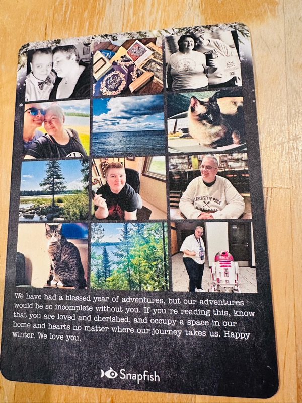 We've gotten fewer cards than in many years - Canada Post rotating strikes, people are busy, postage is expensive - but we got enough to fill the pockets in our card stocking. Suzanne's post introduced me to Swistle's card rating system, which somehow I had missed, and it is fire. I am totally stoked at all the extra points my multiple random pictures would garner according to this system, but I did not have enough time or hand strength to write in all the cards this year WHICH IS FINE. I did about thirty-five and still had about 20 left to do when I had to clear all the stuff off the table. I'm hoping to finish most of them between Christmas and New Year's.