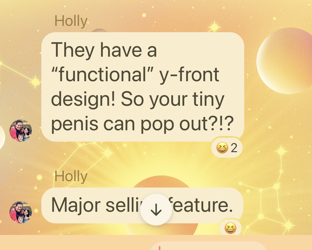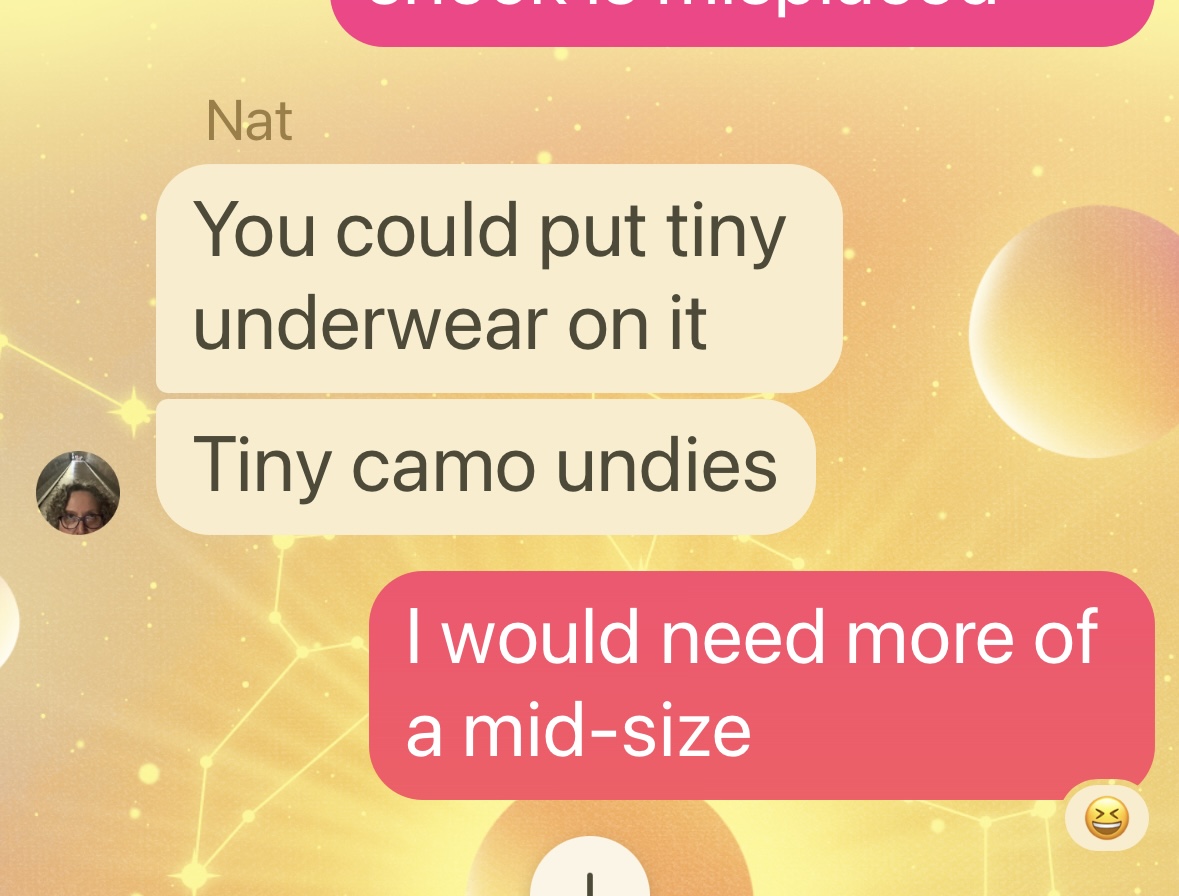 Husbands, be on guard. We might have to erase our chat history. Possibly related, shortly afterwards she sent us this, lamenting that it wouldn't get here in time for our lunch date on Saturday.
