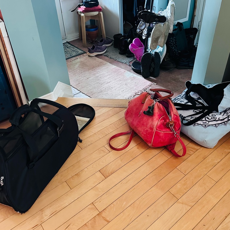 This morning Matt was loading the car while I was still trying to get organized and get my shoes on. This resulted in a complicated and amusing kind of dance where I was trying to find my shoes and get them on and tie them, but also flattening myself against the wall when Matt came back in and reached past me to grab a bag. At one point I almost kicked him in the head with a shoe that wasn't even on my foot yet.